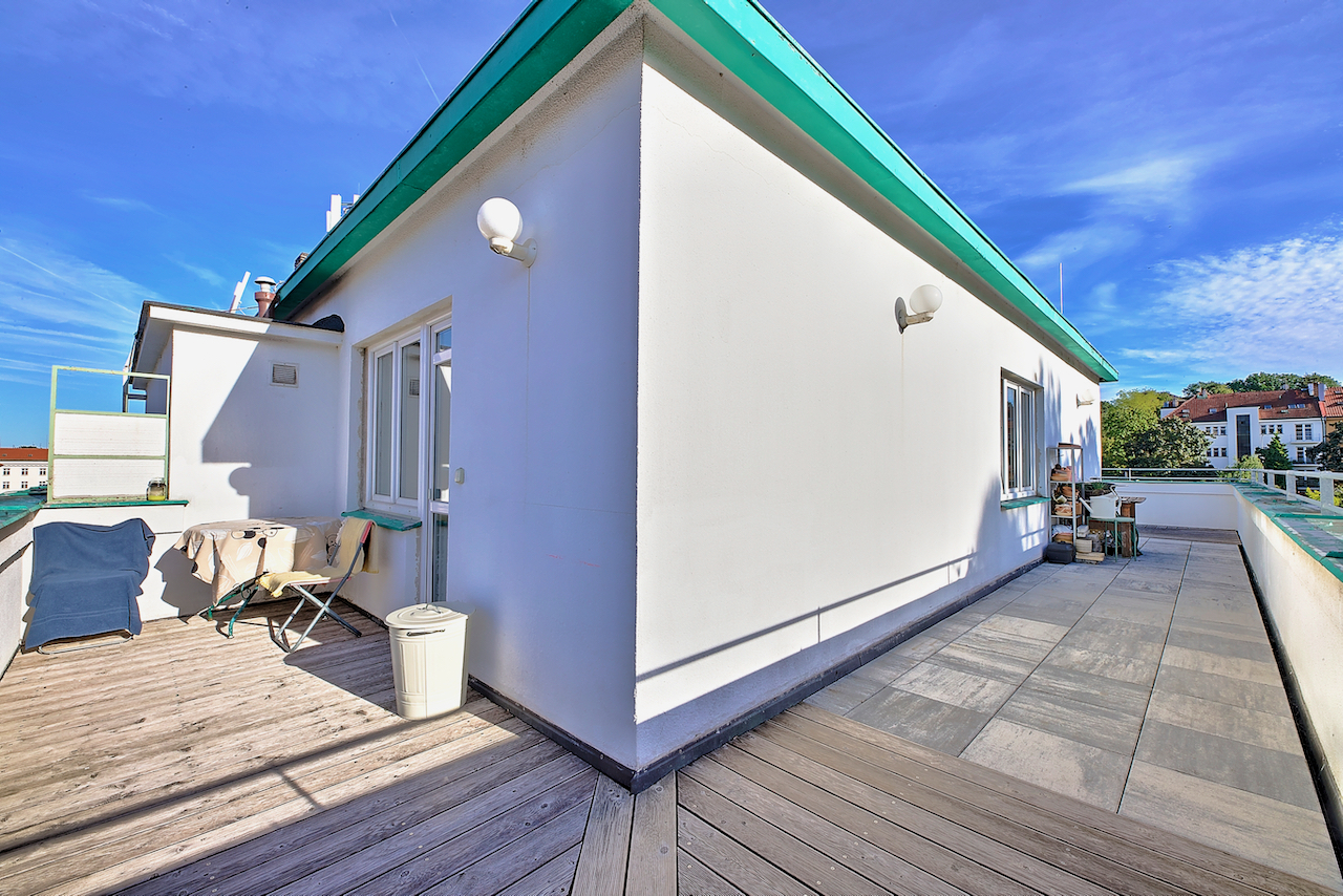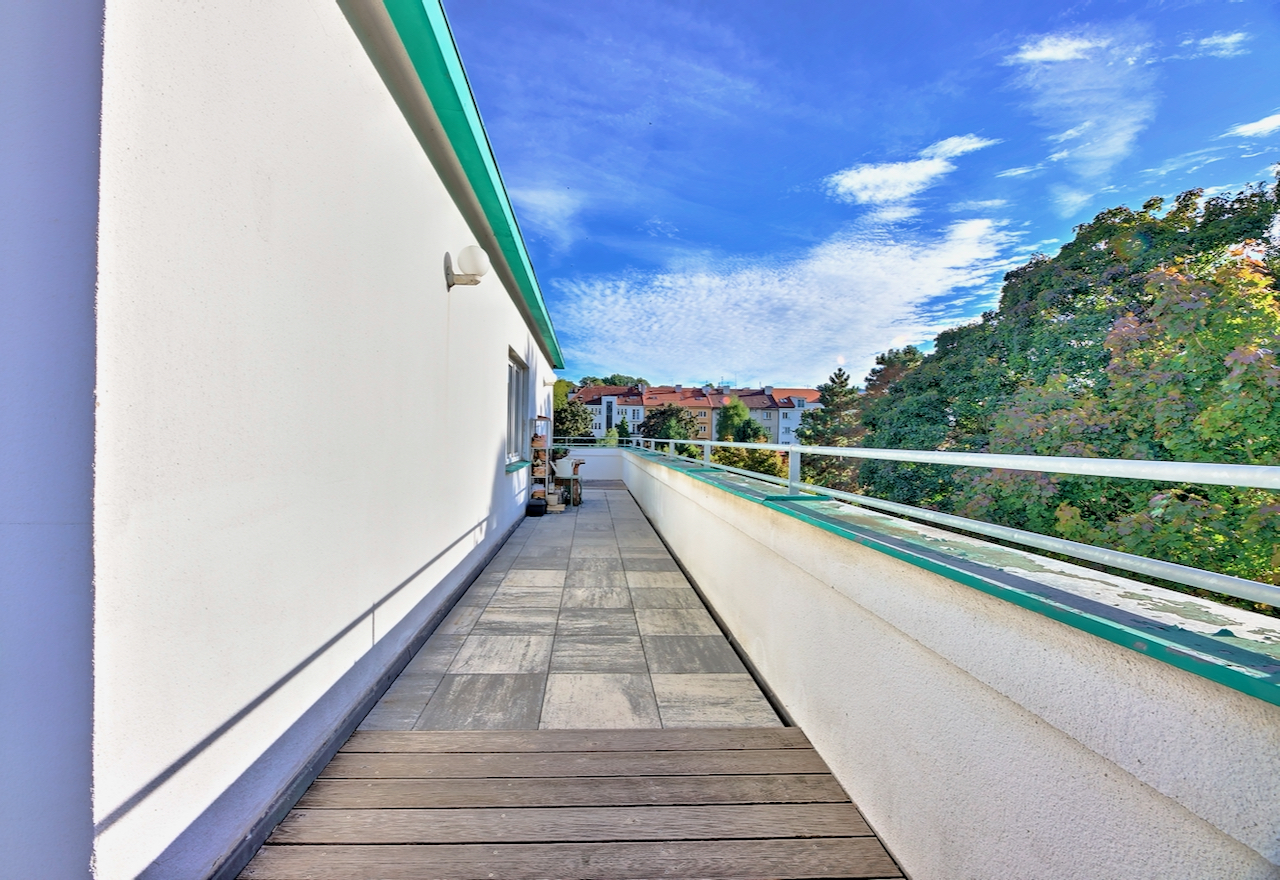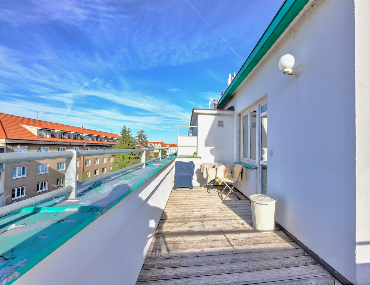 Byt zaujme především velkou terasou, která jej obepíná ze všech stran.