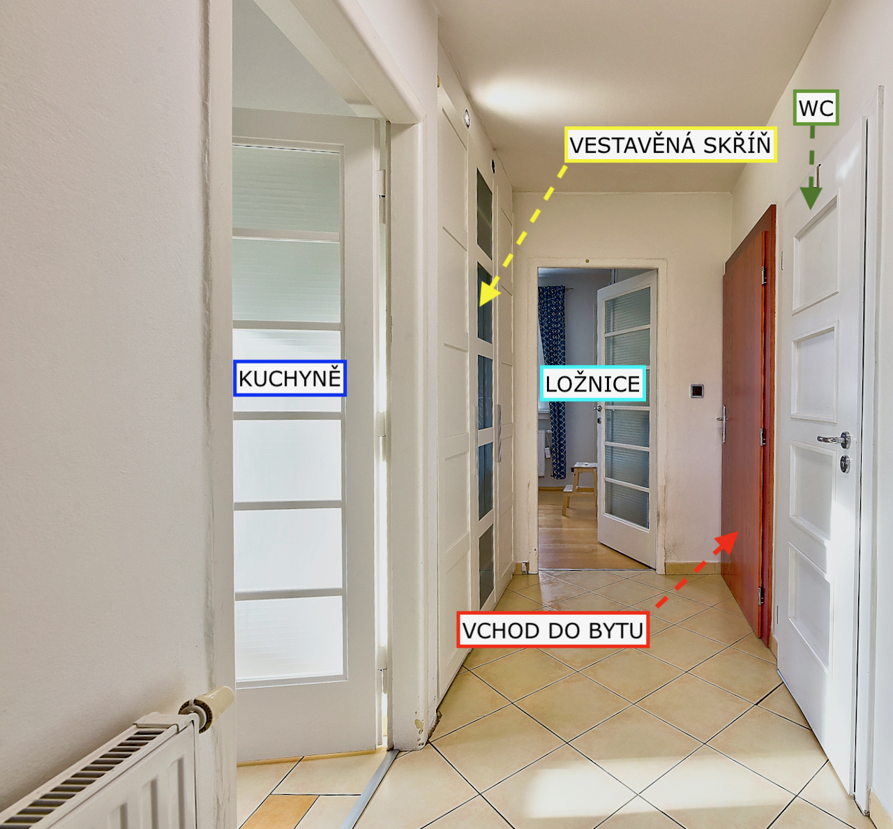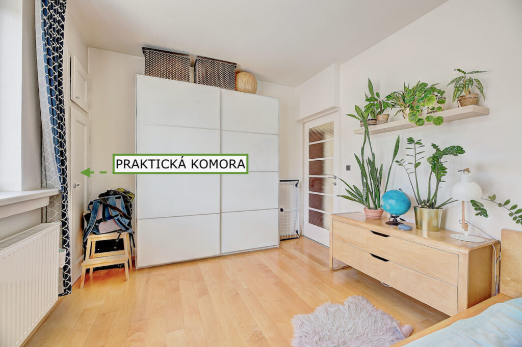 Příjemným benefitem je praktická komora v ložnici, vestavěná skříň naproti vchodu do bytu a bezpečnostní vstupní dveře, které zvyšují komfort i pocit soukromí.