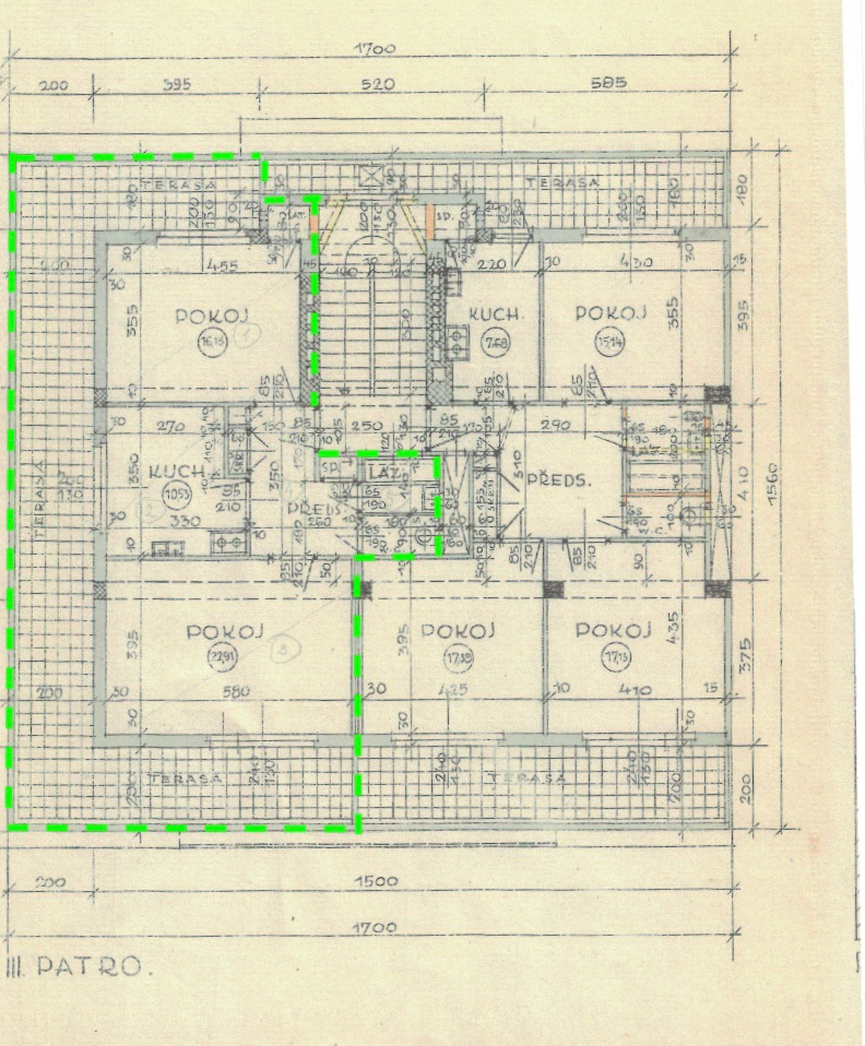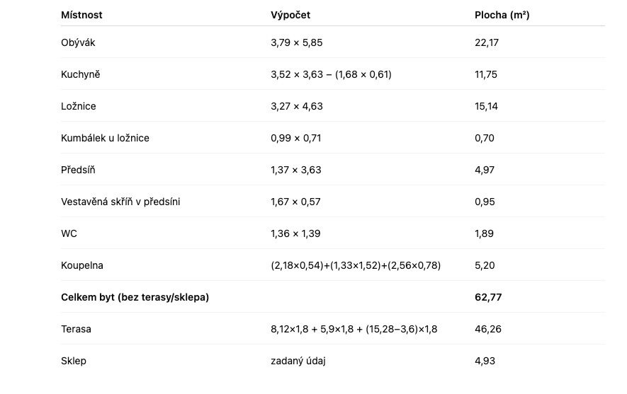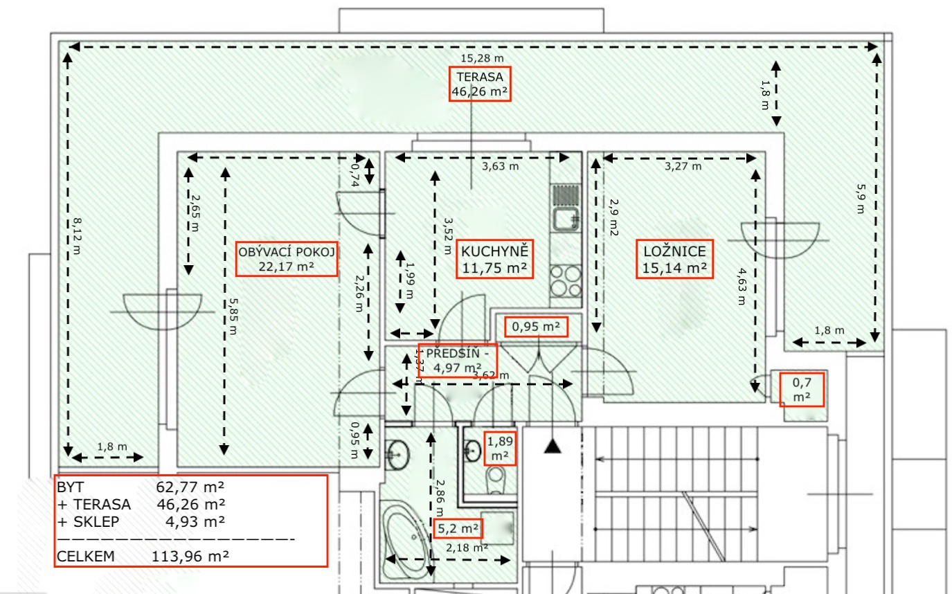 Byt jsme pro jistotu přeměřili a vyšlo nám byt 62,77 m² + sklep 4,93 m² + terasa 46,26 m² = 113,96 m² užitné plochy.