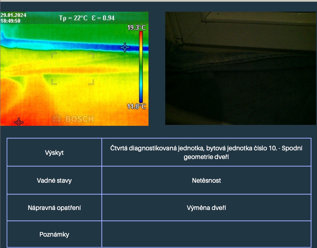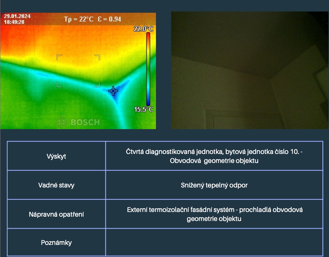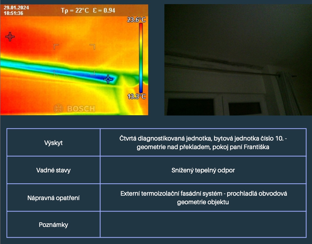 K posouzení tohoto problému byly pořízeny termovizní snímky prostupu tepla pláštěm budovy a zpracována odborná zpráva s doporučením možného řešení.