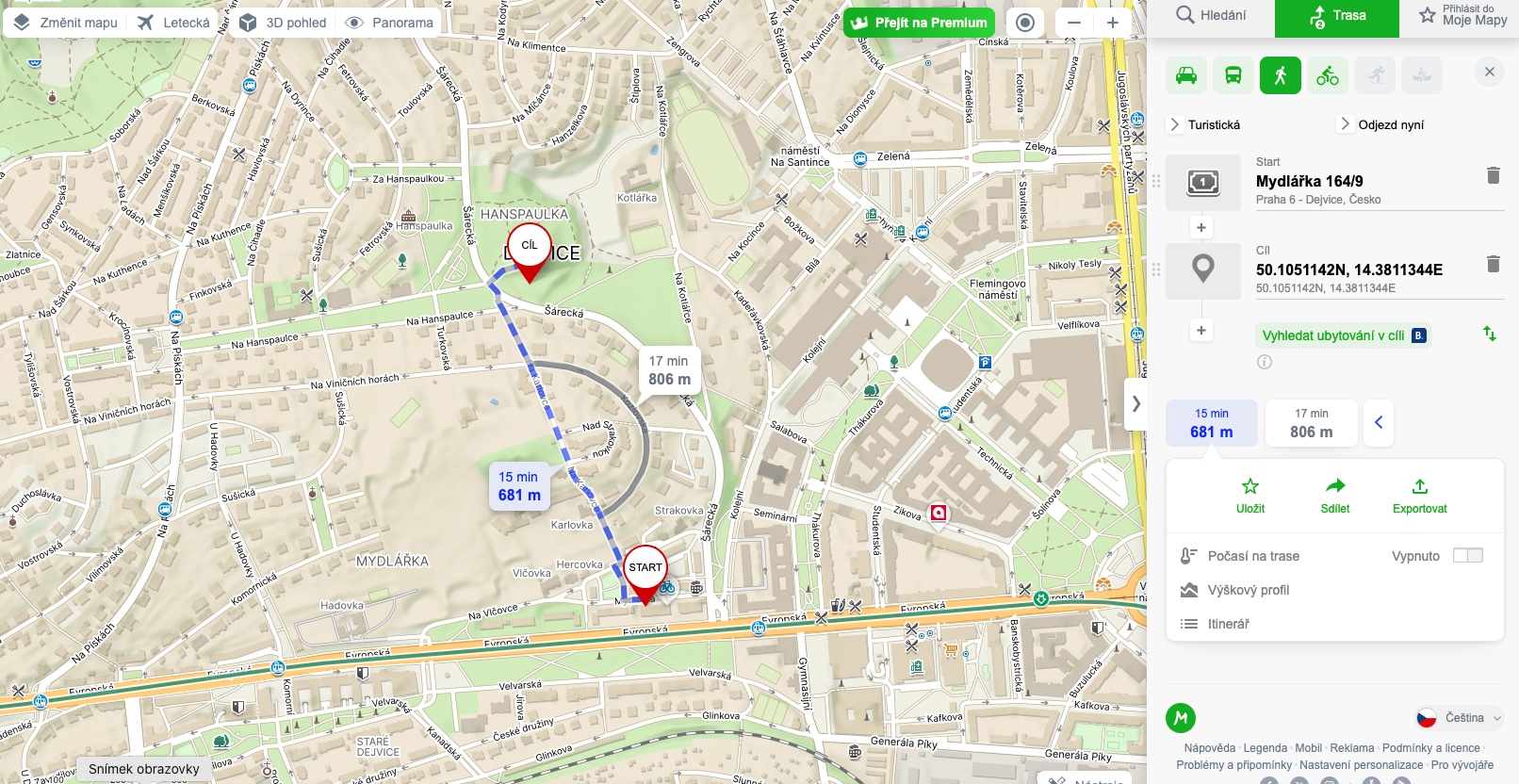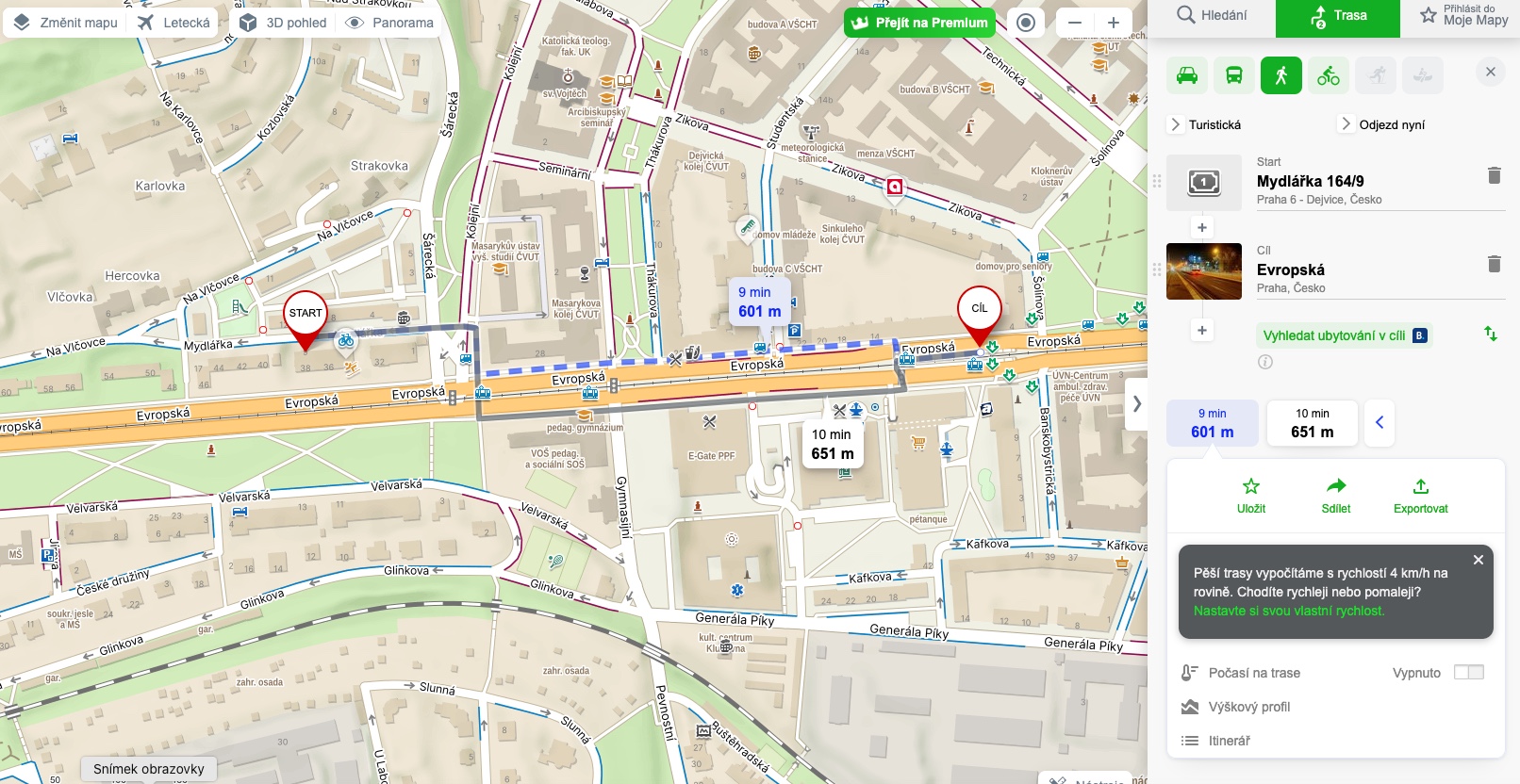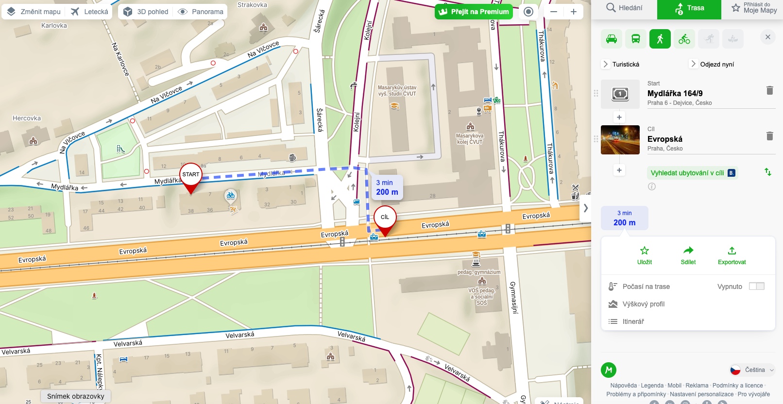 - orientace: obývací pokoj jih (Evropská), kuchyně západ (koruny stromů), ložnice sever (ul. Mydlářka)