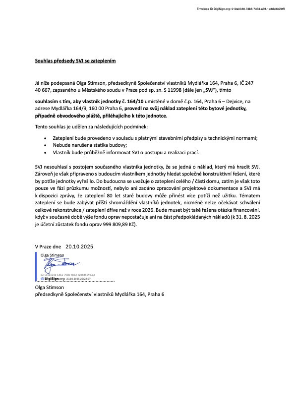 Dokument od SVJ potvrzující, že nový majitel bytu má možnost si zateplení z vnějšku případně provést je k dispozici [ke stažení zde]