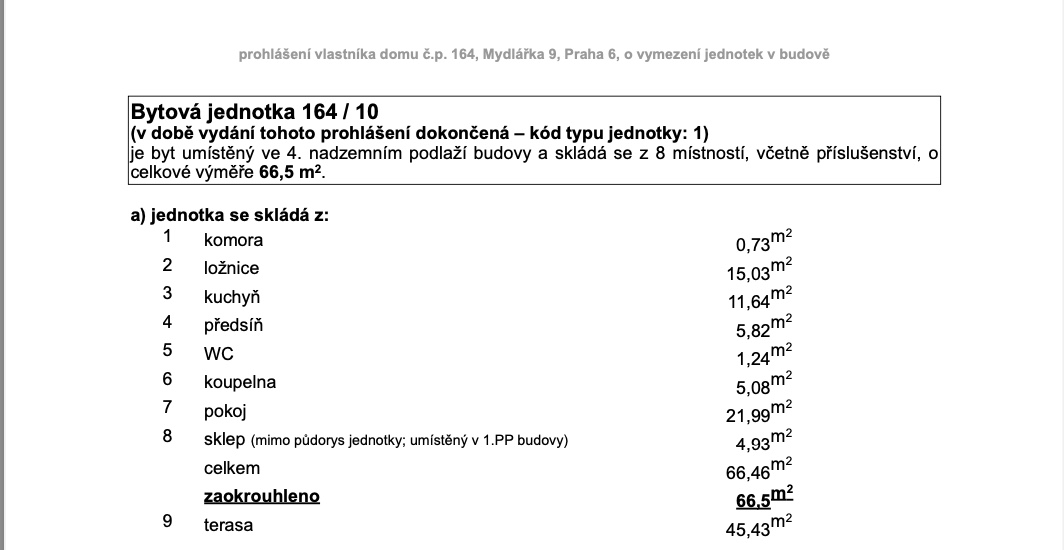 Podle Prohlášení vlastníka má byt 61,57 m² + sklep 4,93 m² + terasa 45,43 m² = 111,93 m².