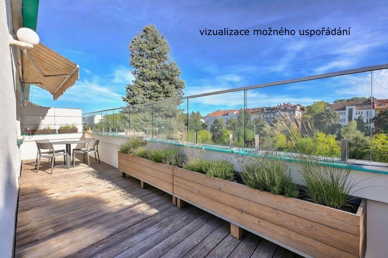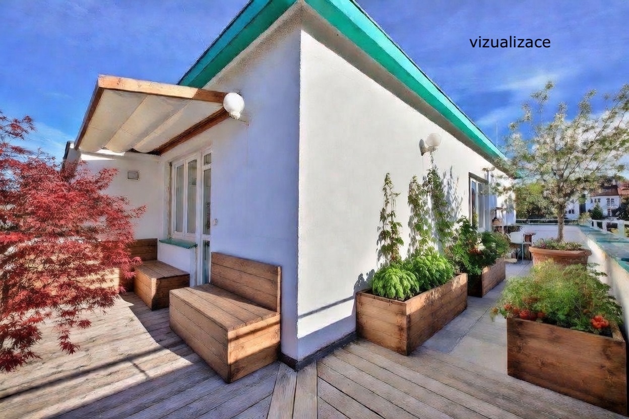 Byt zaujme především velkou terasou, která jej obepíná ze tří stran.