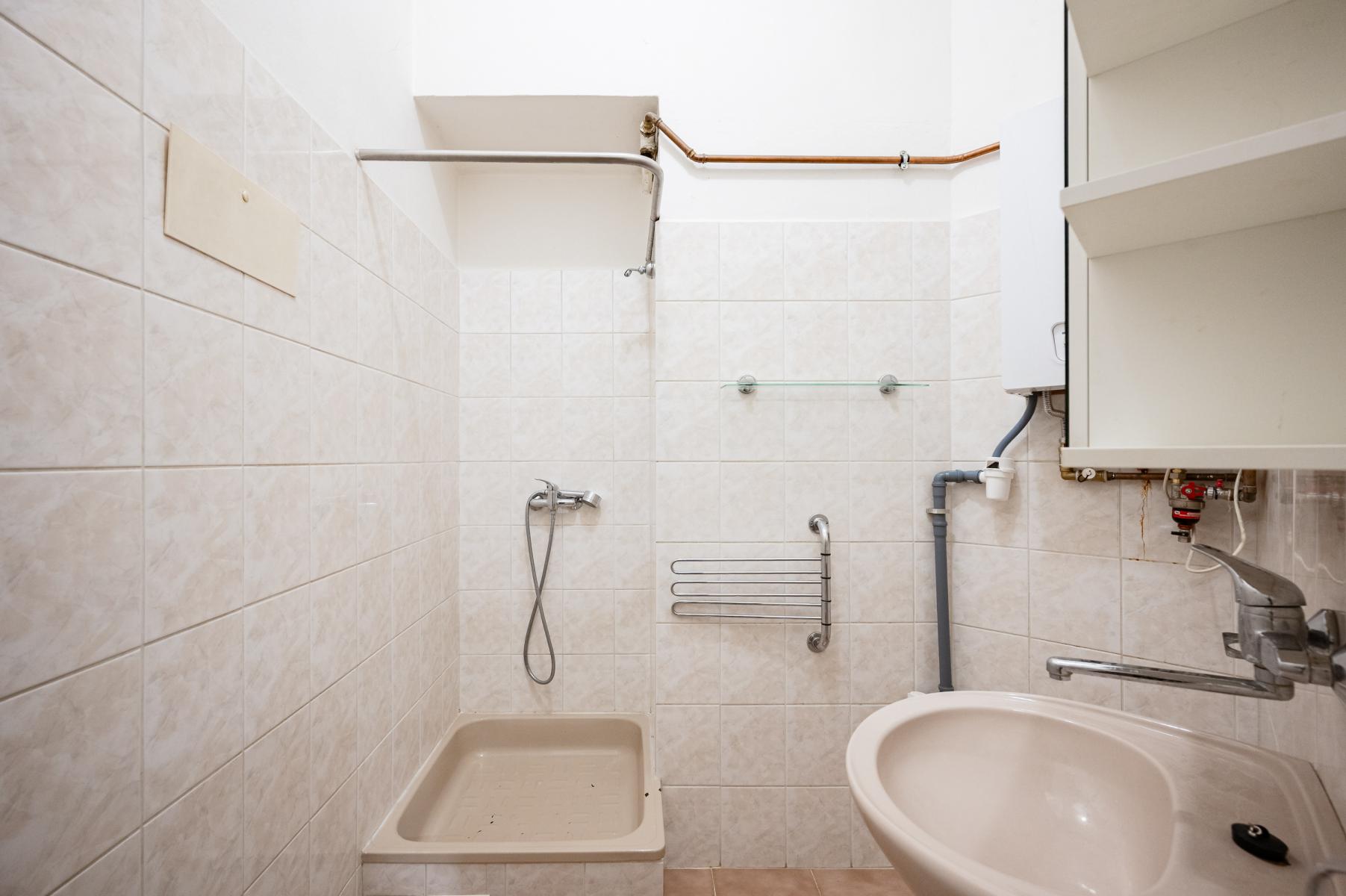 Byt je ve stavu před kompletní rekonstrukcí, bude třeba výměna elektroinstalace i rozvodů vody. Vytápění zajišťuje zánovní plynový kotel.