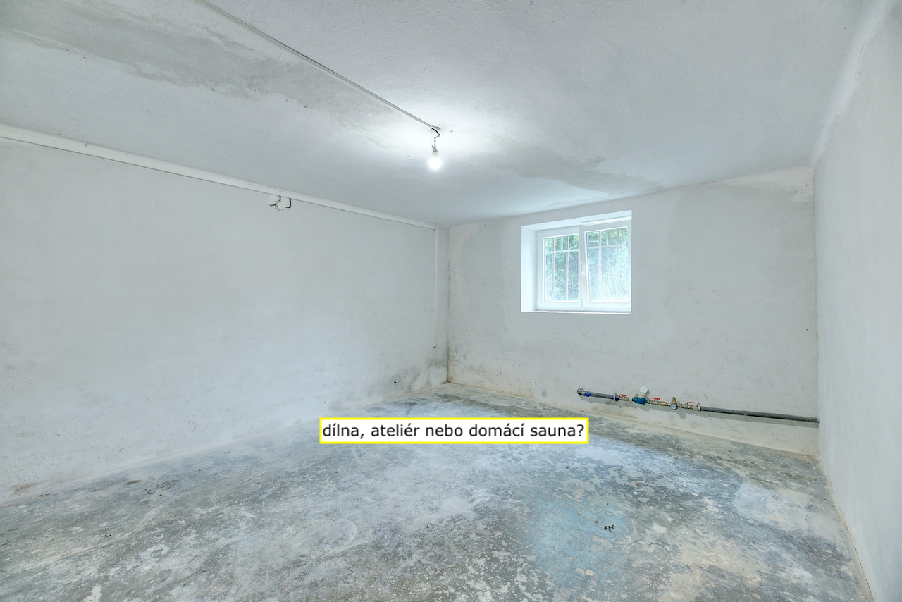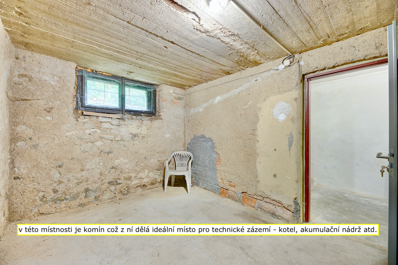 - Sklep: dvě místnosti – vhodné jako ateliér, dílna nebo technické zázemí (kotel, akumulační nádrž)
