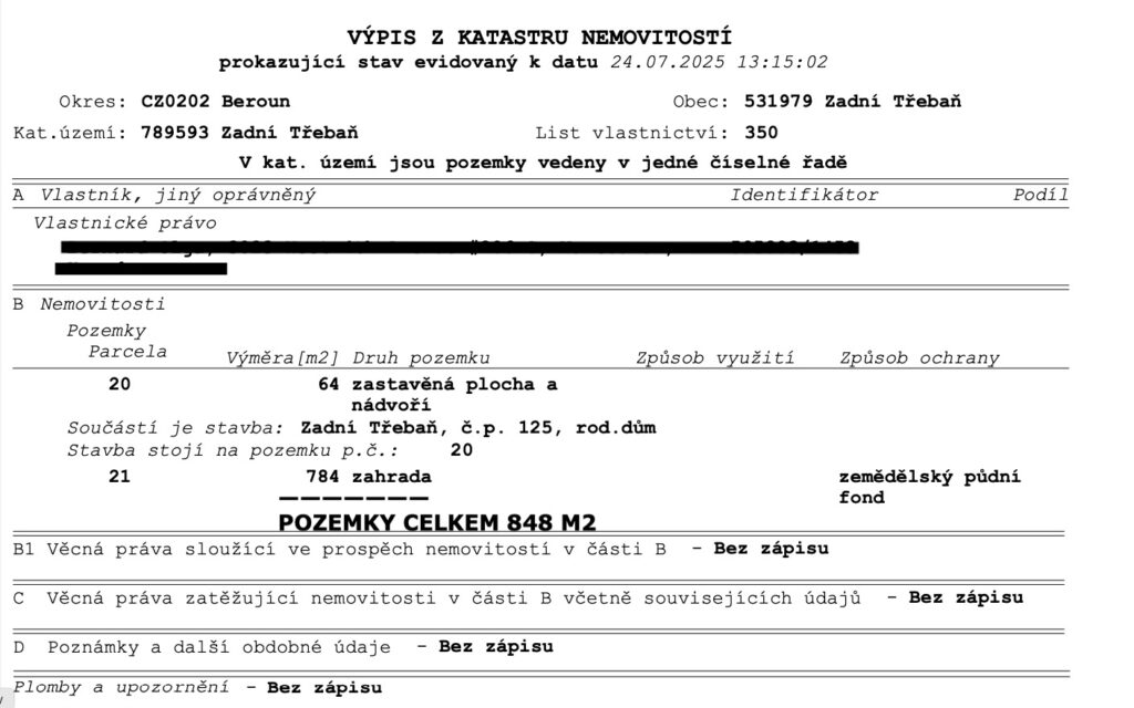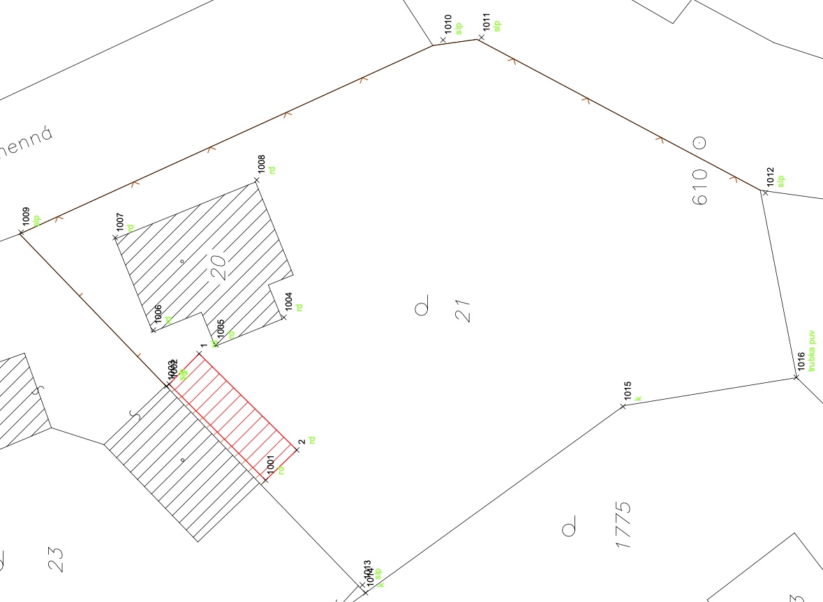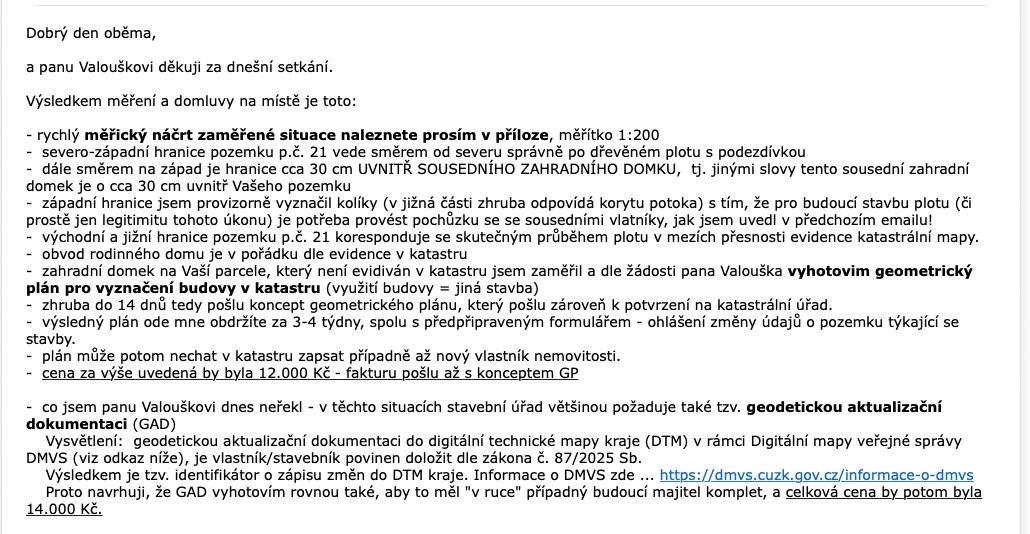 V průběhu kontroly právních náležitostí jsme narazili na fakt, že tato malá stavba není v KN zakreslena. Proto jsme povolali geodeta, který přístavek zaměřil a připraví geometrický plán, na jehož základě jej bude možné do katastrální mapy zanést. Geodet také zjistil, že umístění domu odpovídá skutečnosti. Zároveň obešel hranice pozemku a v místě, kde není plot (u hranice potůčku), pro vyloučení pochybností umístil několik hraničních kolíků (email geodet viz. níže)